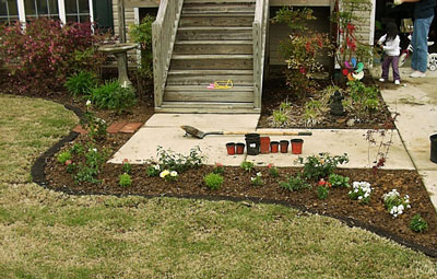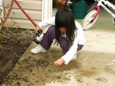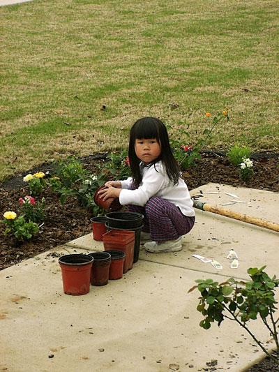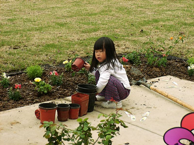 Out front is the biggest improvement. We planted lantana, calendula, snap dragons, verbena, evolvulus, a japanese maple, dahlberg daisies, candytuft, and what was called a lily of the valley shurb. Amy helped me pick out a lot of the flowers, expressing a definite opinion of what she liked and didn't like. She also had fun washing the tags from the flower pots and arranging the different pots into different piles based on their sizes. |