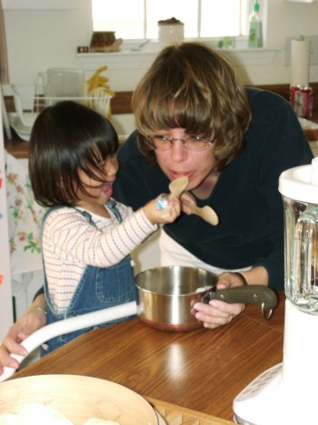 In honor of the new year, we had a Chinese dinner here at home this evening. While it wasn't the traditional dinner, we did have pot stickers, steamed pork buns, and steamed red bean buns for dessert. Amy certainly seemed to enjoy every bite she ate.