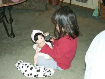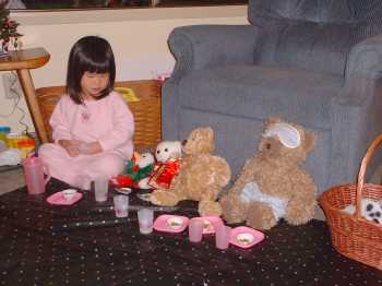 Two of her Christmas presents were play sets, one tea set and the other a Tupperware pitcher, cups and plates set. She thoroughly enjoys playing with them and setting up tea parties for herself and her animals. Yesterday they even had to be put out so that they could have lunch with her.