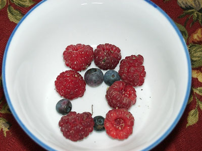 She's been having fun harvesting raspberries and now blueberries from our garden this summer. We've had about 20 raspberries so far and picked our first 4 blueberries. Amy made her own fruit salad for lunch, ate all of them and then some we had bought at the store as well. She did manage to share 3 raspberries and 1 blueberry with me. When I first turned them down she got very upset and insisted that I have them. I've never seen anyone get quite so upset when you refuse to take something they are wanting to share.