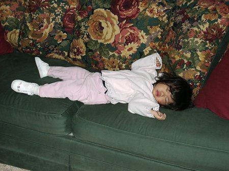 For the past day and a half I have been to a Creative Memories weekend crop workshop, so Dean has been taking care of Amy. I guess the excitement was too much for her this morning that she fell sound asleep on the way home before lunch. Dean laid her down on the couch, where she took a short power nap before lunch. She then still took her regular two hour nap this afternoon, much to everyones surprise.