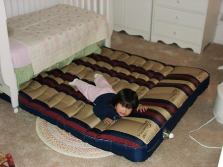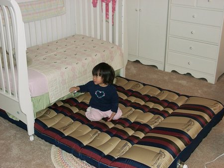 Amy is now moving to a big girl bed. Her crib converts to a toddler bed just by taking the one side off. As you can see by the pictures today, we are placing an air mattress on the floor beneath her for the next few nights - just in case.