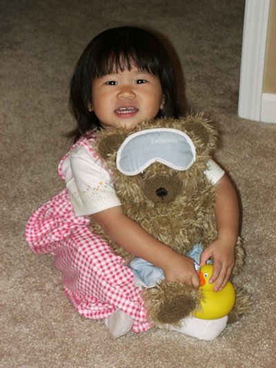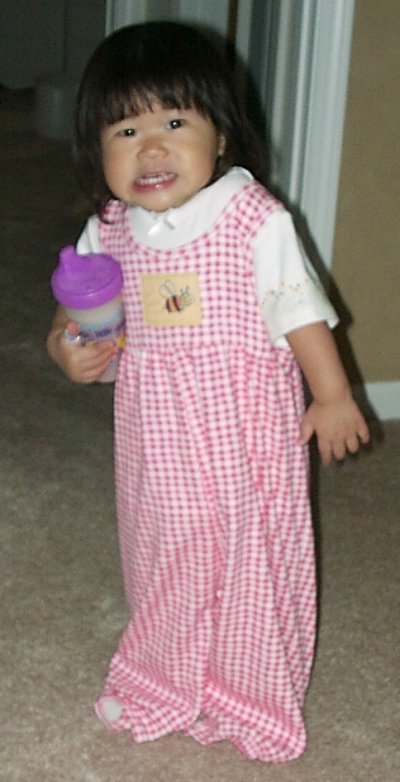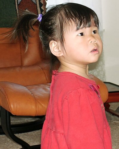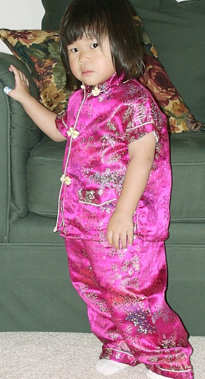 She found one of her Chinese outfits in her closet the other day and wanted to put it on over her clothes. We did and managed to get a picture, but she doesn't look very happy about it. Hopefully we'll be able to get a better picture of her in the outfit for her birthday. It's amazing how it just fits, except the pants are a little too long still. Guess she won't have the problem I do of trying to find pants that are long enough.