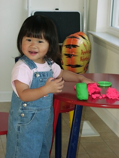 Amy has discovered play dough. She has 2 cans of neon colored (green and pink) play dough and is having a blast playing with it. She was standing at her table picking it apart in small pieces, saying what sounded like doughnut for each piece that she pulled off. I'm not sure what the significance of that was, but it was cute. I have two more cans hidden in the closet for her birthday. Hopefully she'll still be enjoying playing with it by then.