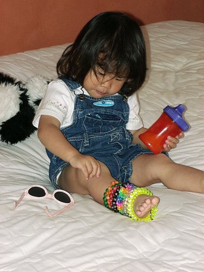 She is also enjoying playing with her sunglasses also known as gla-glass, and her bracelets. Which first were on her wrists, then on mommy & daddy's wrists, then on her ankles. She is being more creative lately, playing more independently with her toys and coloring on her easel.