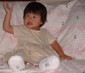Other words include: cow and moo (especially when we are driving by Berry College and she knows that there are supposed to be cows in the field next to the road). Ta-ta is thank you. Plh is please. She is also using her toothbrush, although only a couple of teeth get brushed at any time, but she's definitely got the idea as to what it is for.